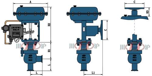 卫生级气动调节阀采用多弹簧薄膜执行机构及卫生级调节阀阀体组成。