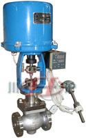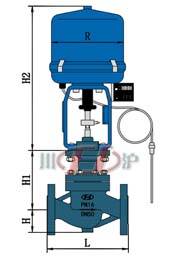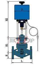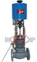 自力式电控温度调节阀由控制阀门、电动执行机构、温度传感器和温度调节器等部件组成,根据用户需要,分别有加热型与冷却型两种结构。加热型调节阀的结构与原理,见附图示:工作前主阀芯处于半开位置,传感器处于自然状态。接上电源,主阀芯全开。介质由箭头方向流入主阀体、经阀芯对储热箱进行加热。当温度升到相应设定值时,传感器即产生相应线性信号输入一体化执行机构,随即驱动阀杆、阀芯产生位移,关闭主阀芯停止加热。当温度低于设定值时,传感器即产生线性信号输入一体化执行机构,驱使阀芯渐开,使介质按抛物线特性流入储热箱,进行加热直至设定值。这样被控介质始终在设定温度范围内被控制,从而达到控温目的。